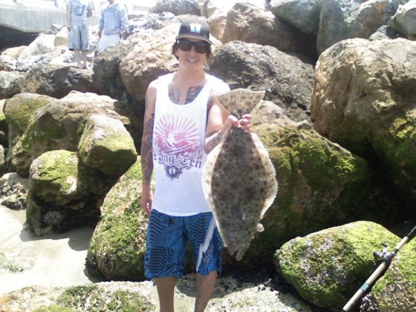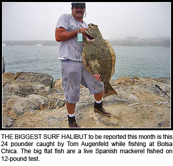 Matt with a nice size hali caught with a Berkley Gulp! swimming mullet (MORF) out of the Bolsa Chica Jetty. 6/16/09