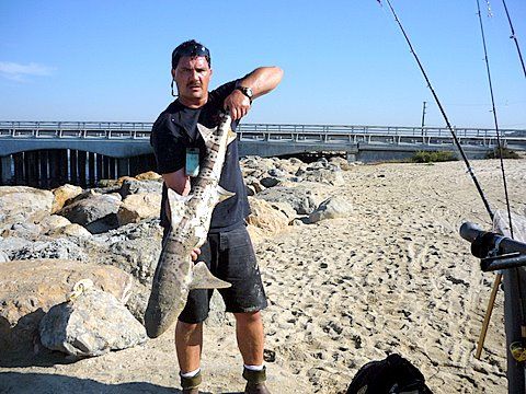 Tom with a 4' leopard shark caught off of Bolsa Chica Jetty on 1/3/09.