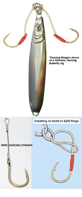 Dancing Stingers™, attached to the eye of a jig greatly increase hooking power. Fish can no longer leverage hooks and jigs out of their mouths due to the flexible Technora™ connection. Super strong Technora™ loops attach to durable, flashy Titanium Gold Finish Super Needle Point hooks.
